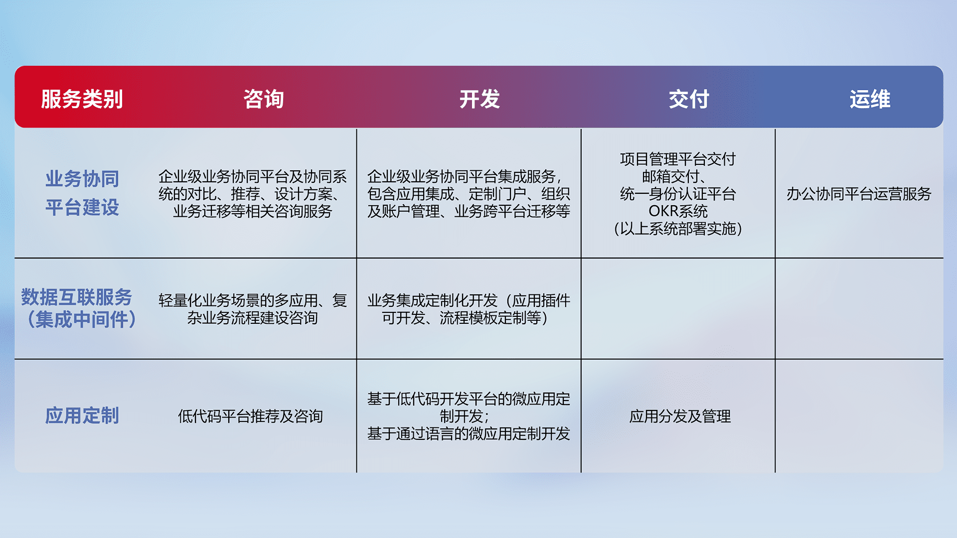 针对钉钉、、、、企微、、、IDaas等平台级产品提供产品的规划、、、、方案、、、、交付、、、定制化开发等服务,,实现如统一协同办公、、智能客户服务、、、混合会议管理、、智能数据查询、、等业务场景,,,实现数字化转型。。