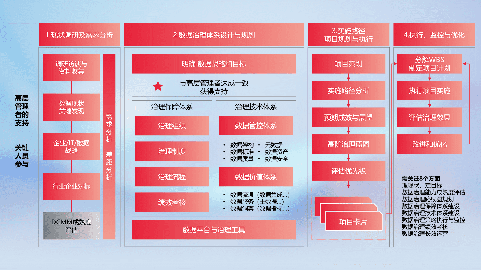 制定并执行统一的数据标准,,,规范数据定义和格式,,,,消除冗余和不一致性,,,,实现跨部门和跨系统的数据一致性,,,为企业提供标准化的数据基础。。